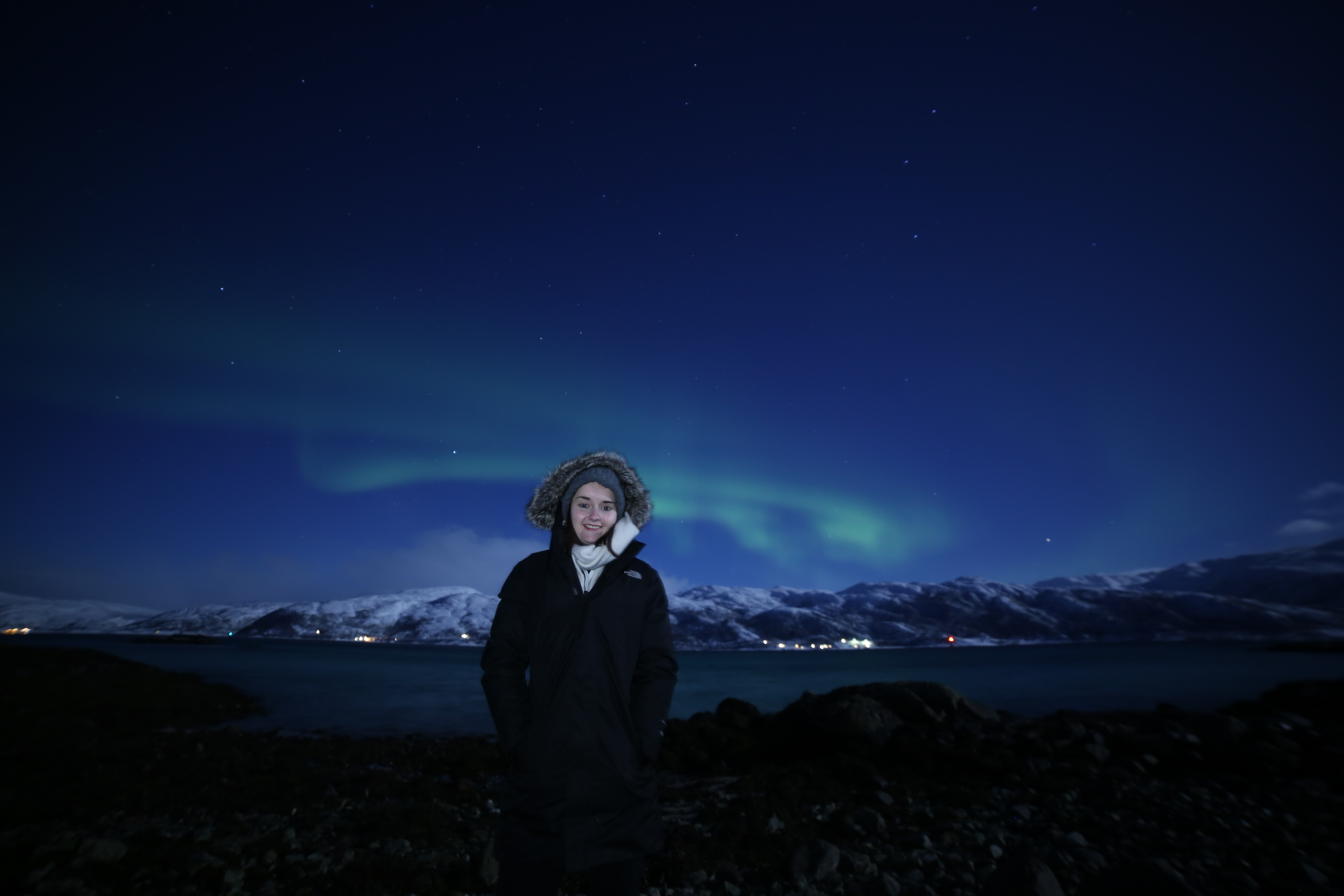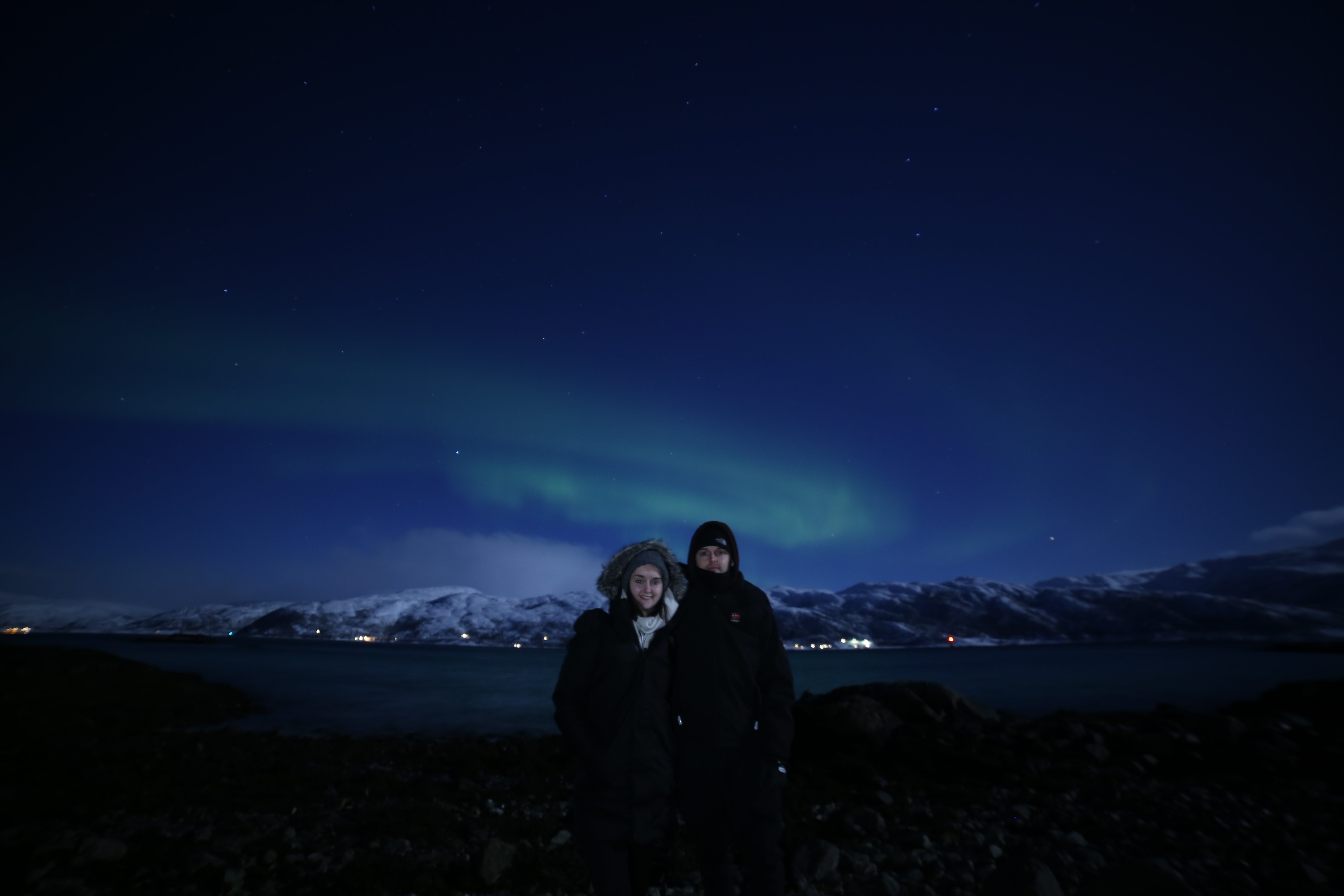 We went out to a small beach to see the northern lights, it was absolutely freezing, but so worth it. The group we went out with brought hot drinks and marshmallows, we made a fire toasted marshmallows and we were lucky enough to see the lights. Something I’ve always wanted to see and I’m so happy I got the chance. It was beautiful but freezing, we stayed out till about 23:30 before calling it a night honestly if it wasn’t so cold I could of stayed out for longer. The lights started out small and then they grew, they didn’t get much brighter than you can see in the pictures, but they danced and flickered I guess getting brighter then fading.